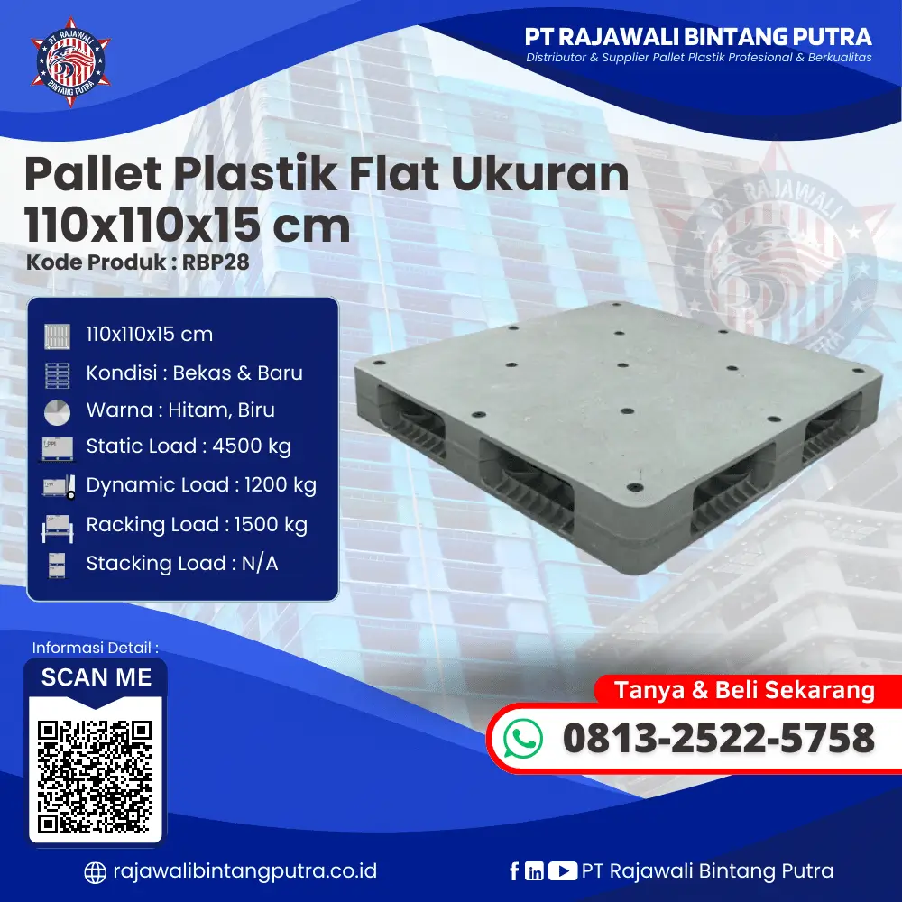 Dalam industri logistik dan pergudangan modern, efisiensi dan keandalan adalah dua aspek yang tak bisa ditawar. Untuk mendukung kebutuhan tersebut, PT Rajawali Bintang Putra menghadirkan produk andalan: Pallet Plastik Bekas & Baru Ukuran 110x110x15 – RBP28. Didesain untuk memenuhi standar industri nasional dan internasional, pallet ini merupakan solusi cerdas bagi berbagai sektor industri yang membutuhkan alat handling material yang kuat, awet, dan ekonomis.